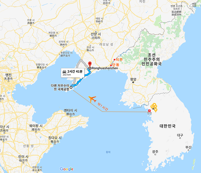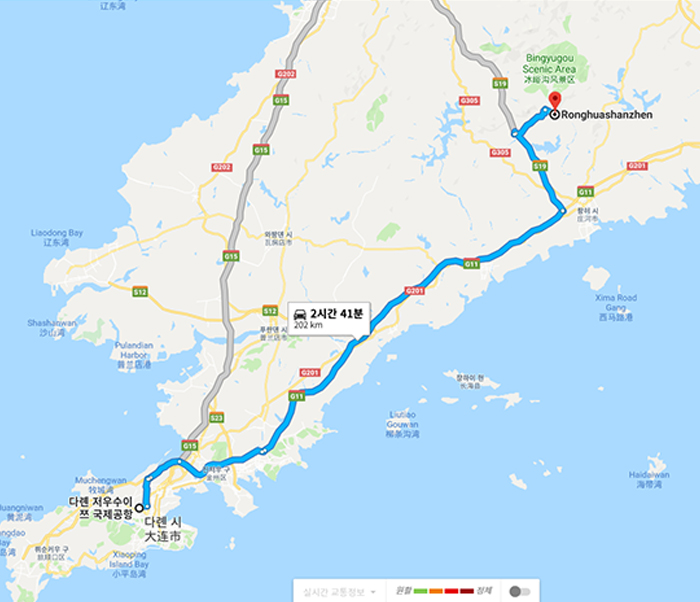 다렌 공항-용화산진[ 2시간 41분(202 km)]